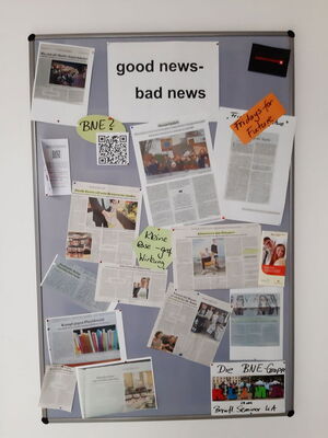 Eine Moderationstafel mit aktuellen Good news - bad news runden neben den BNE News der Woche auf den drei Anzeigetafeln im Beruflichen Seminar das Angebot zum Themenbereich ab.